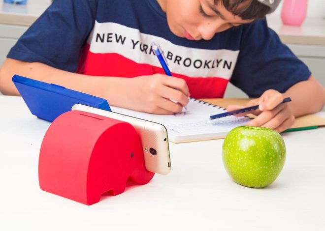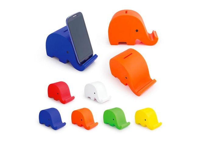 Alcancía con diseño de elefante. Su trompa sirve como holder para celular. Con tapón en la parte inferior para vaciar la alcancía.