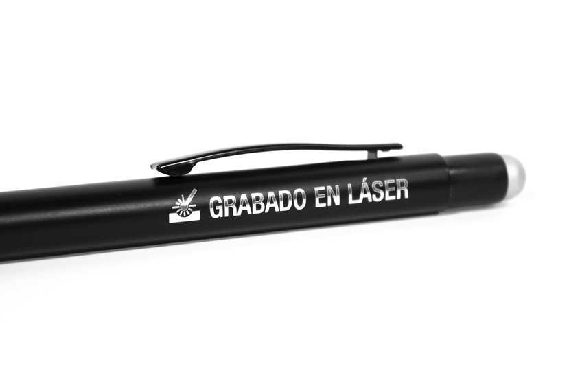 Metálico. Pulsador touch color plata. Clip metálico. Cuerpo negro mate. Destapa electro plateado en parte superior e inferior del bolígrafo.