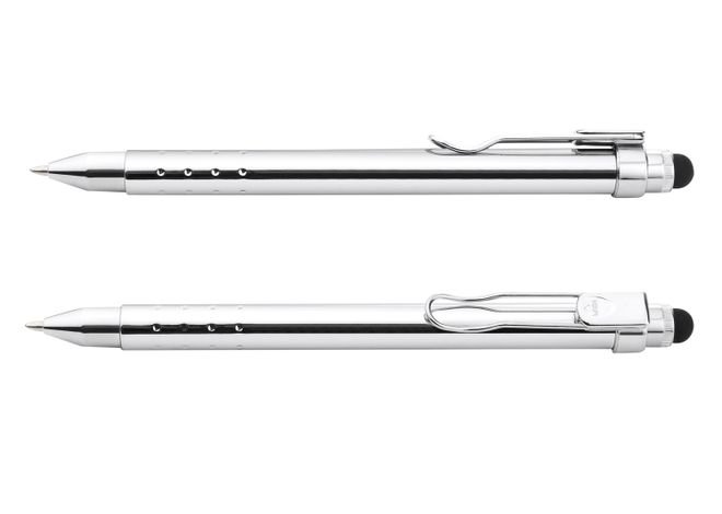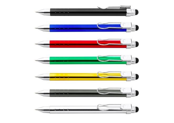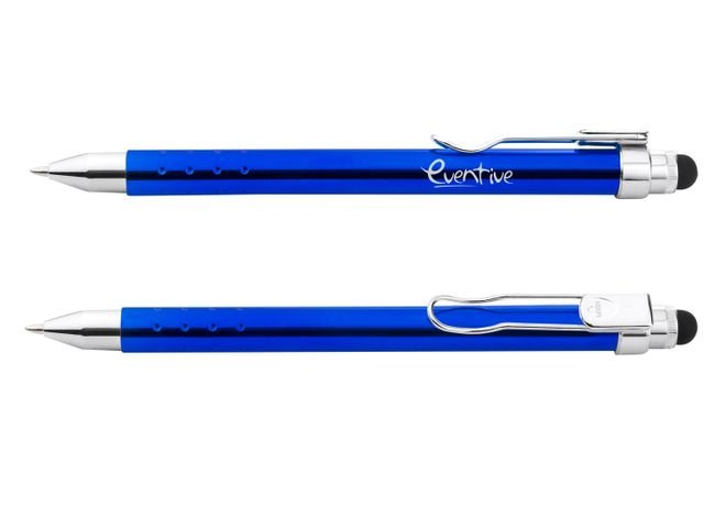 Bolígrafo retráctil en el clip, con acabado en UV, clip y punta plateados con stylus en la parte superior. Mina tipo Jumbo.