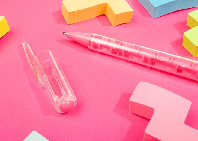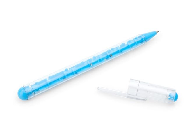 Bolígrafo plástico con tapa, en la parte interna tiene un juego para disfrutar mientras se utiliza