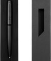 Metal. Cuerpo color negro mate. Pulsador, clip y puntera plata. Tinta negra. Destapa plateado