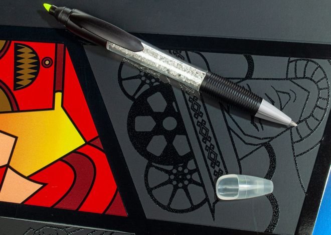 Bolígrafo plástico con resaltador. Doble Tapa. Cristales en la parte central para dar diseño