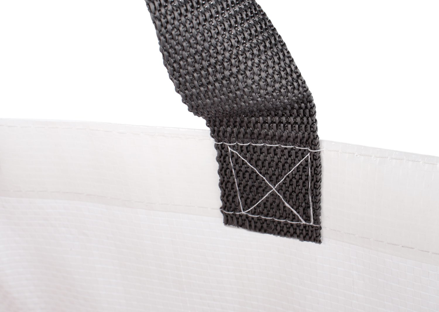 Bolsa plástica reutilizable cosida de gran capacidad, con manija de tela y botón en la parte superior para cierre. Útil para librerías, mercados, tiendas de comestibles, etc.