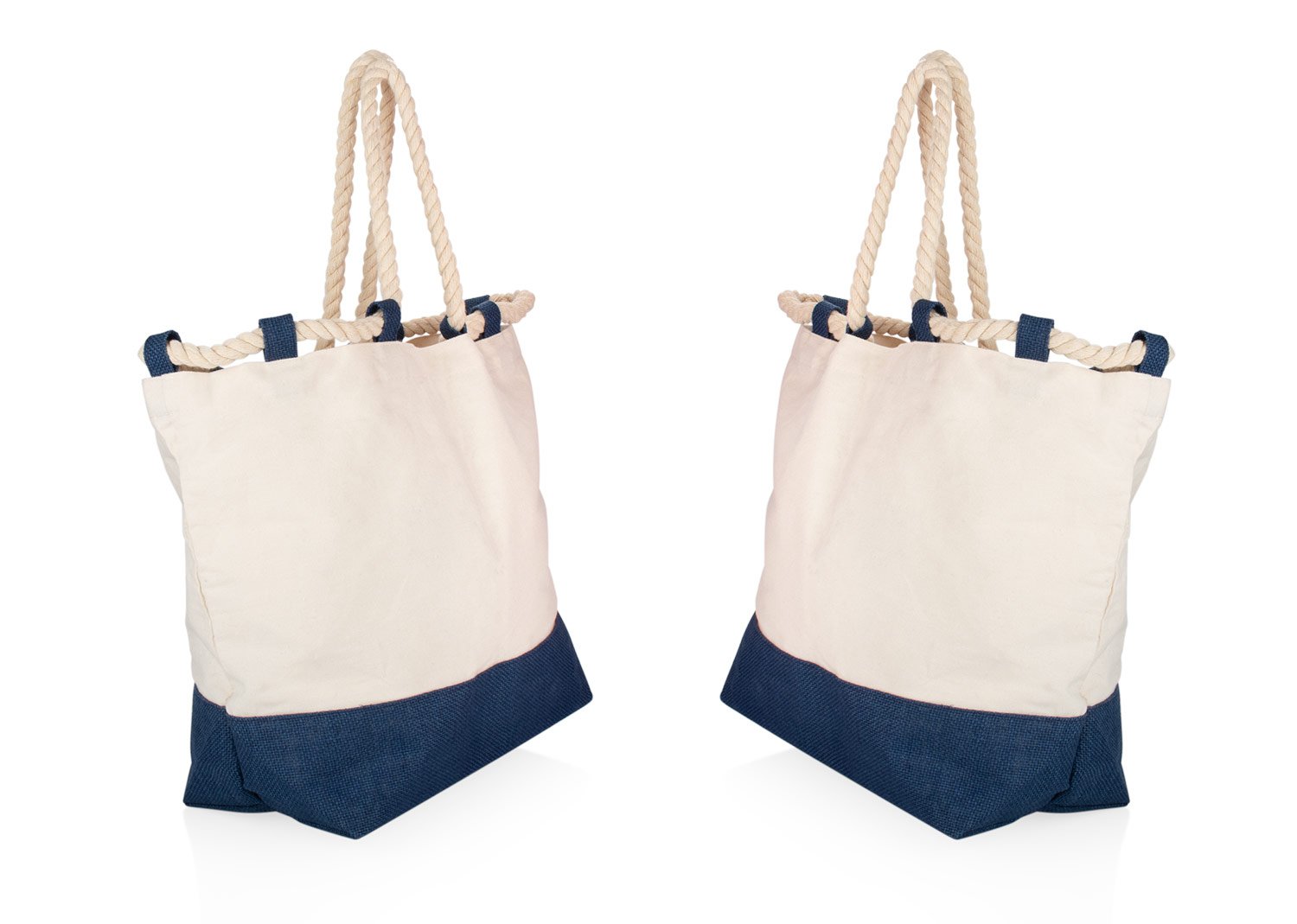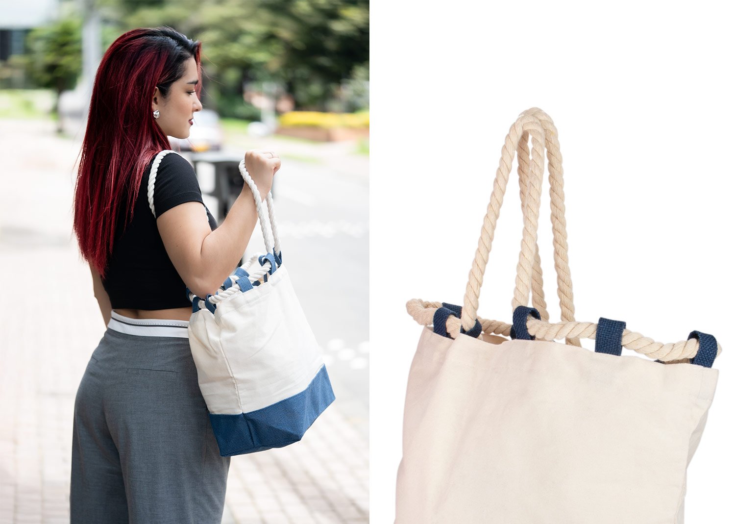 Bolsa de playa de estilo fresco, fabricada en yute y algodón. Cuenta con resistentes asas de cordón trenzado para mayor comodidad al llevarla.