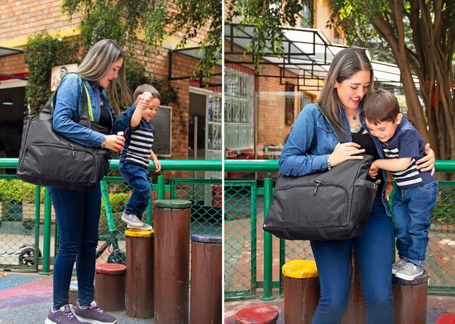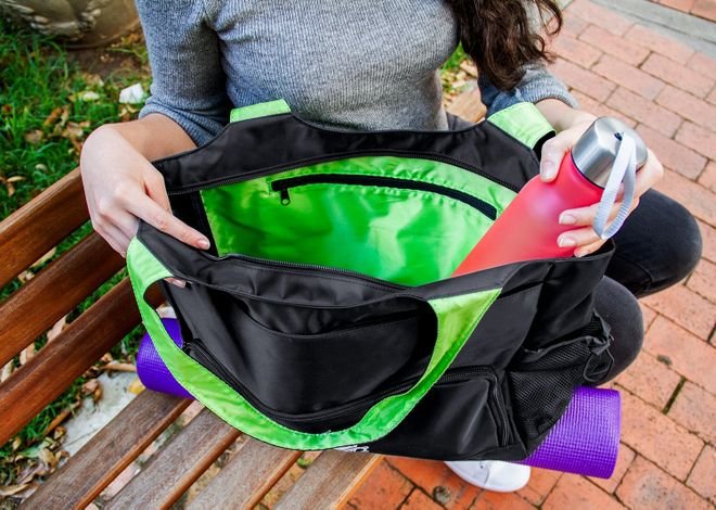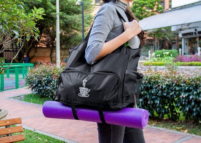 Bolsa Yoga impermeable con doble manija, bolsillo interior con cremallera, bolsillo frontal superior con doble compartimiento al interior y cremallera, bolsillo frontal inferior con extra fondo al interior del compartimiento principal y cremallera, bolsillo lateral en malla con cordón ajustable y bandas elásticas exteriores en la base.
