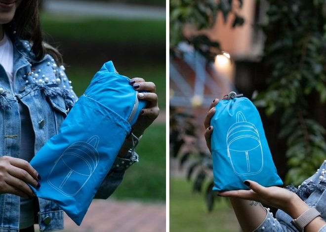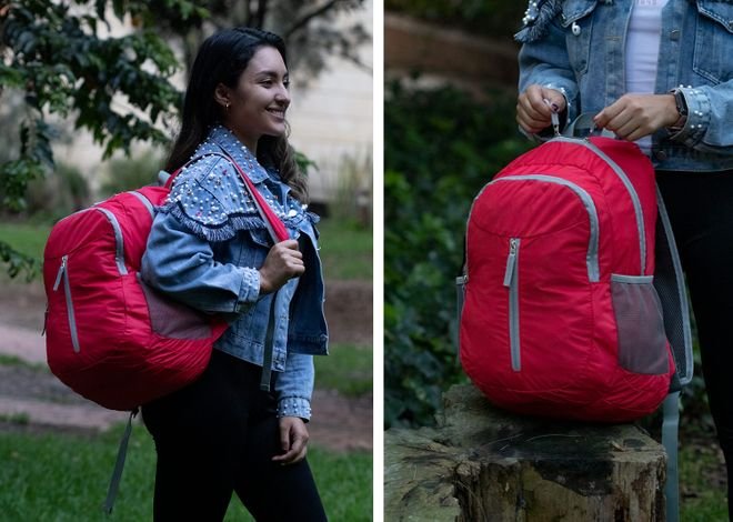 Morral plegable impermeable, con cargaderas ajustables, bolsillo frontal, medio y principal con cremallera, 2 bolsillos laterales en malla para botellas y cables. espacio interior con compartimento ideal para documentos. Incluyee bolsa en mismo material para guardar y transportar facilmente cuando esta plegado.