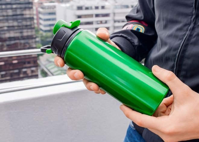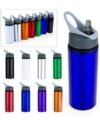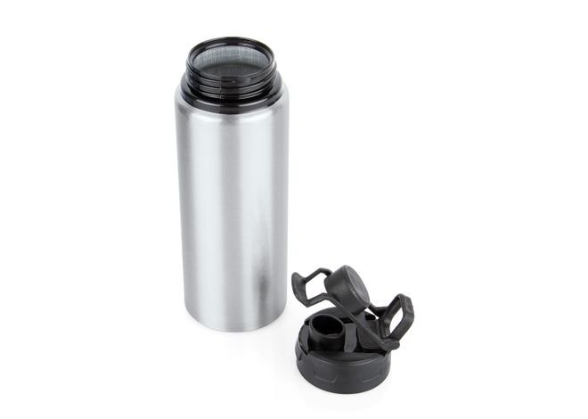 Botella en aluminio con tapa rosca plástica con boquilla y cubierta, manija plástica incorporada para transporte. Capacidad 730ml. Peso: 120g.