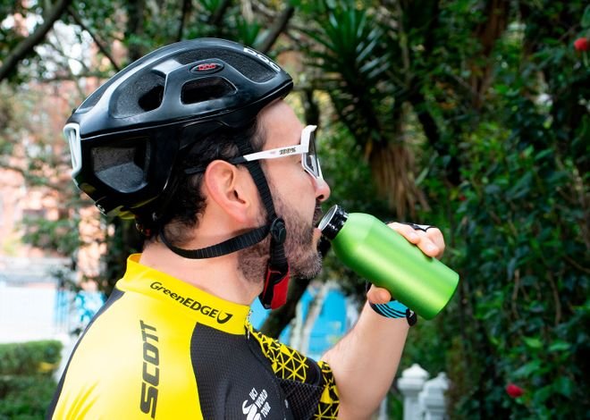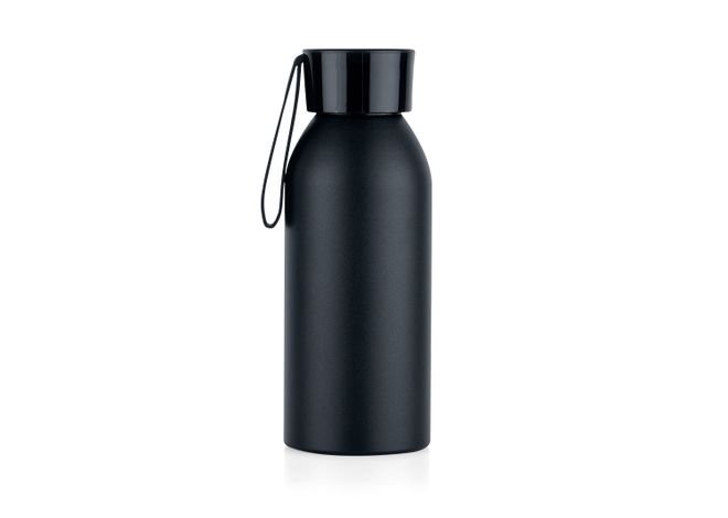 Botella en Aluminio, tapa rosca con correa en goma. Capacidad: 450ml.