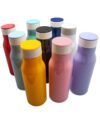 Capacidad 500 ml. Vidrio resistente. Cuerpo traslúcido con tapa de acero inoxidable y tira color gris que permite transportarla. Presentación en caja de regalo.