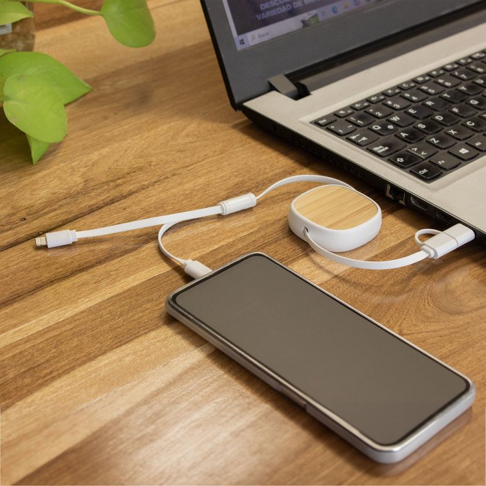Cable de carga retráctil con longitud de hasta 85 cm. Posee un conector Lightning, dos conectores USB-C y un conector USB standard. Presentación en caja de regalo kraft.