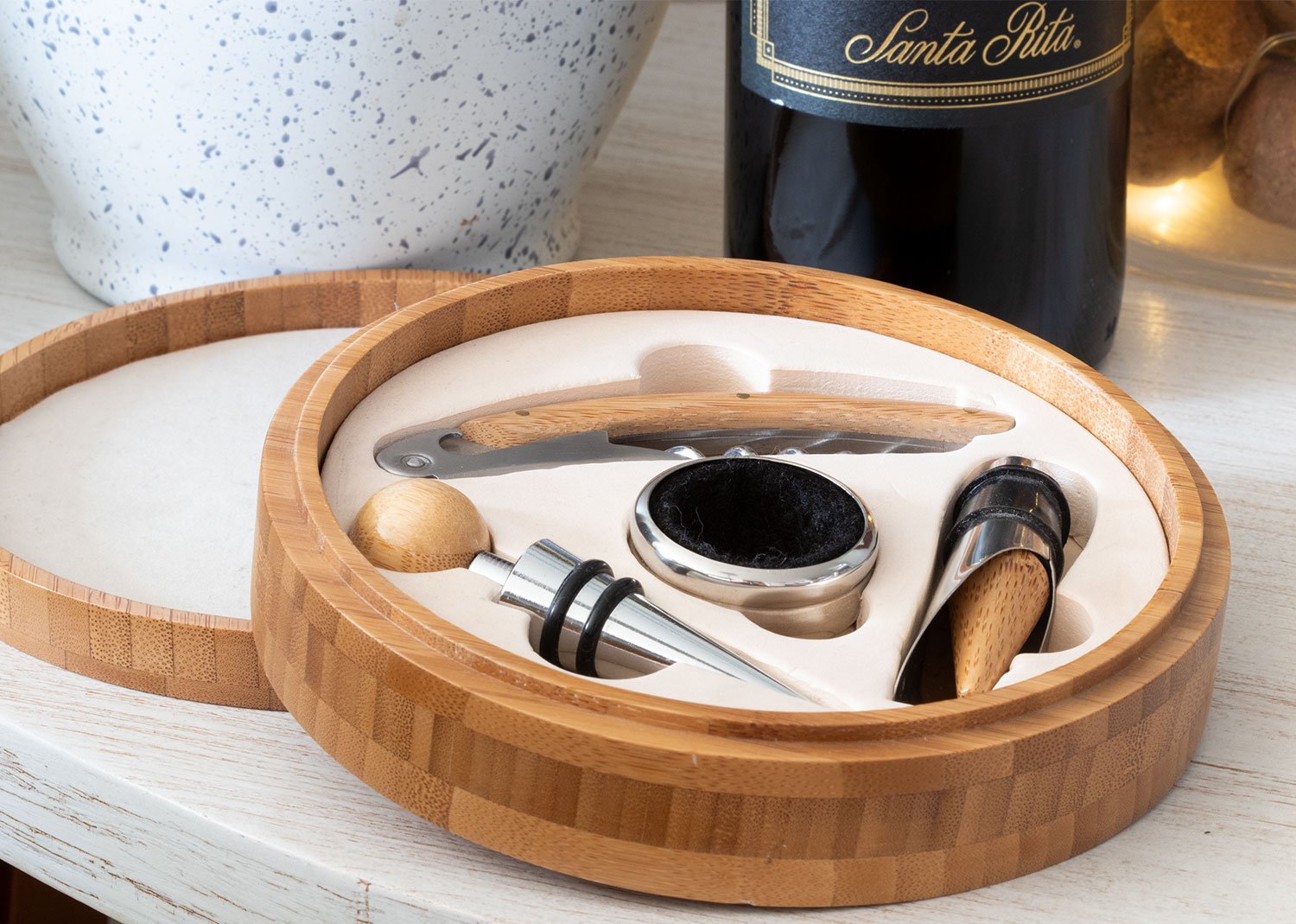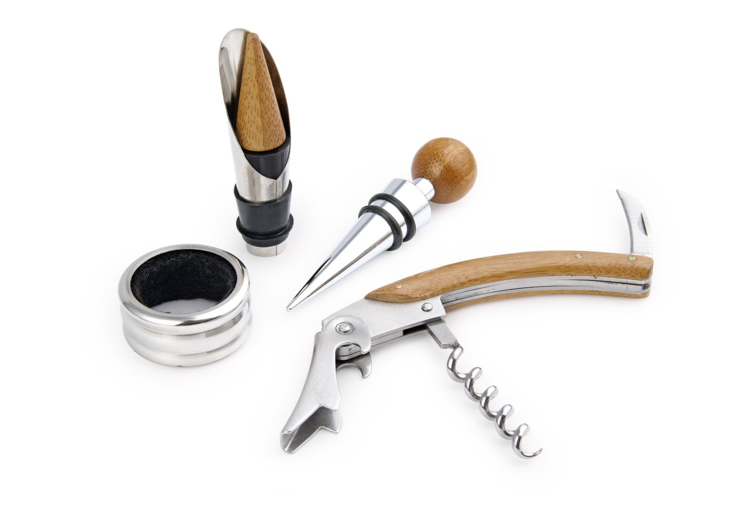 Contiene 4 accesorios de bar con aplique en madera: Tapón para botella, cortagotas, aro antigoteo, sacacorchos de 1 tiempo. Caja interior beige.