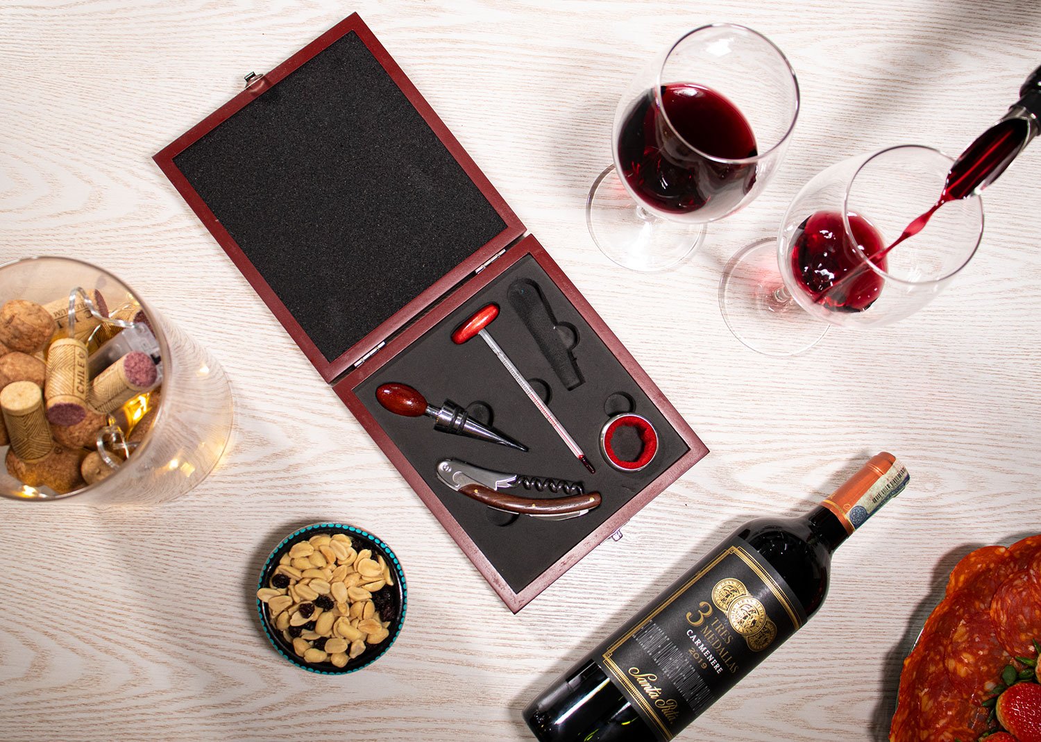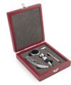 Contiene 5 accesorios con apliques en madera: Sacacorchos de un tiempo, tapón metálico, termómetro, aro antigoteo, cortagotas. Caja vinotinto con interior negro.