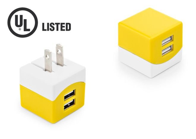 Cargador de pared con 2 puertos USB, entrada 100-240V – 50/60Hz 0,15A, salida 5V-1A. Cuenta con Certificado de Seguridad UL (E361273).