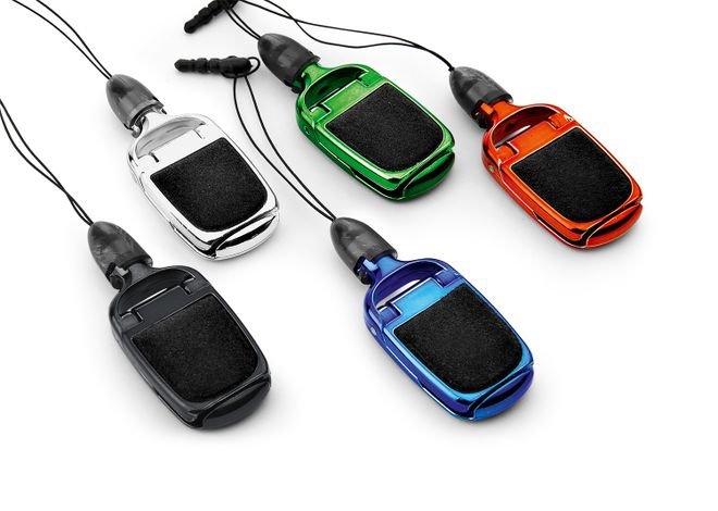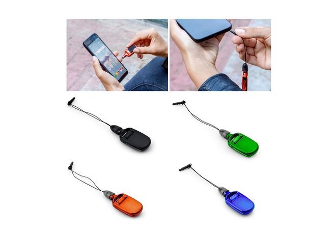 Stylus, Holder y limpiador de pantalla para utilizarlo con dispositivos de pantalla táctil. Incluye plug plástico 3,5 mm, para llevar en el conector de los audífonos del celular y facilitar su transporte.