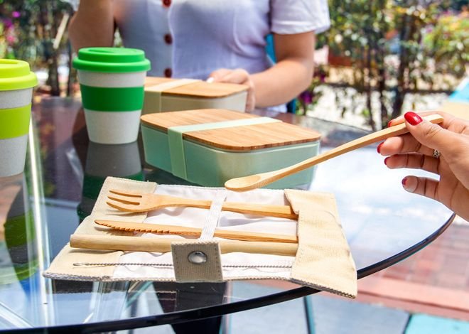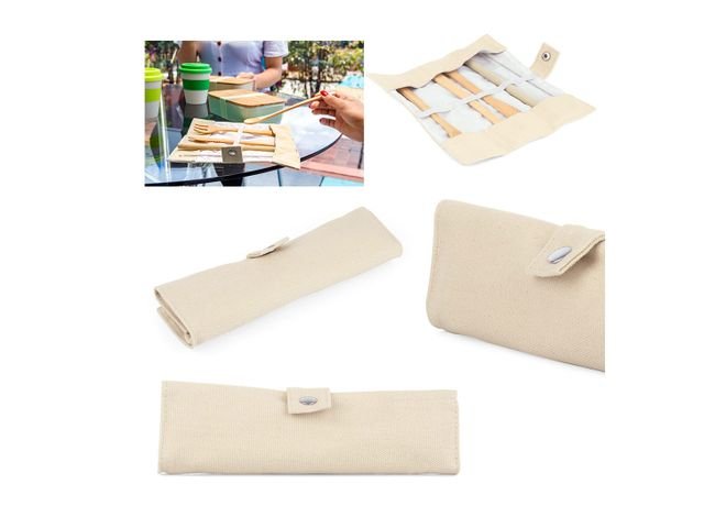 Set de Cubiertos en bambú en estuche textil con cierre de broche, incluye Tenedor, Cuchara, Cuchillo y Pitillo con cepillo para limpiarlo. Sugerencias de cuidado y limpieza de pitillos en Bamboo: Dejar sumergido en agua con sal, durante dos horas y antes de su primer uso. Esto para prolongar la vida útil del producto. Posteriormente se puede lavar con agua y jabón y secar al aire. Producto de uso personal. No se aceptan devoluciones.