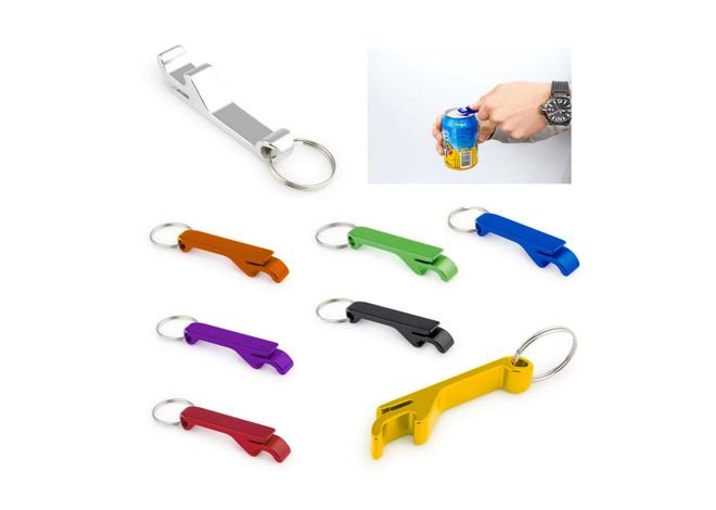 Llavero destapador en aluminio para abrir botellas y latas de gaseosa.