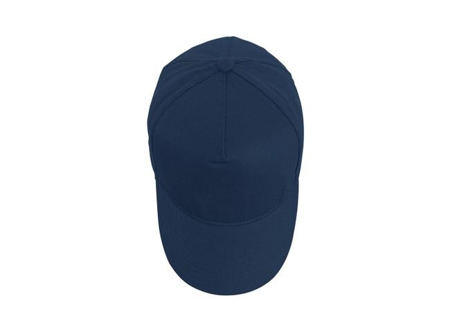 Gorra de 5 paneles con frente fusionado, visera indeformable 4 costuras, botón forrado, 4 ojetes bordados, tafilete textil y cierre plástico.