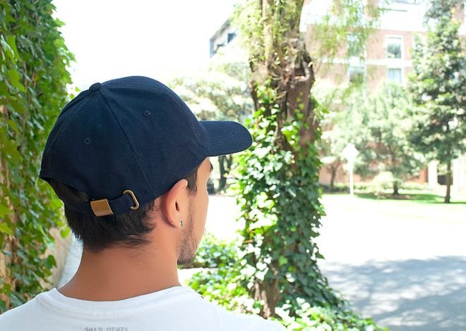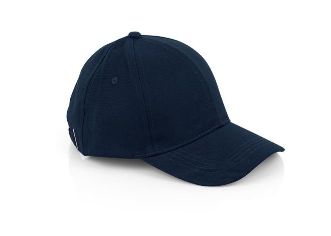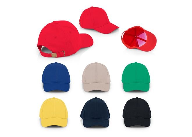 Gorra de 6 paneles con visera indeformable 4 costuras, botón forrado, 4 ojetes bordados, tafilete textil y cierre hebilla metálica.