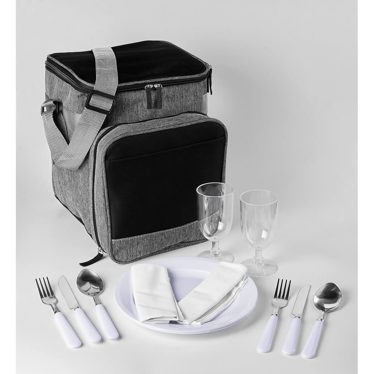 Hielera con compartimento para set de picnic con servicio para dos personas. Interior plastificado. Bolsa principal y bolsa frontal con cierre y correa ajustable. Incluye 2 cucharas, 2 tenedores, 2 cuchillos, 2 vasos de plástico, 2 platos de plástico y 2 servilletas de tela.