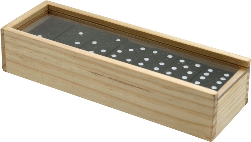 15 x 5 x 3 cm. Plástico y madera. Juego de domino con 28 piezas plásticas, caja de madera y tapa plástica transparente.
