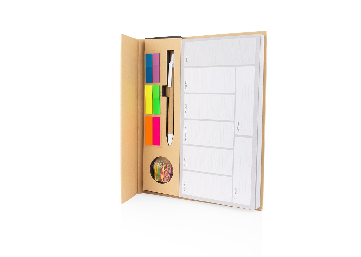 Juego de bloc de notas, cubierta de cartón, 100 hojas con pegatinas de colores, bolígrafo y clips.