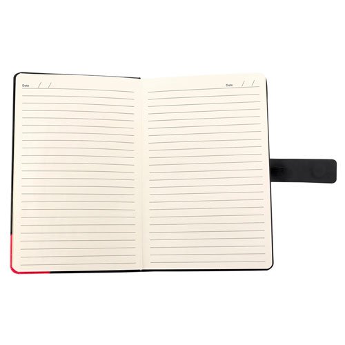 Libreta con 80 hojas de raya. Incluye elástico para bolígrafo, broche imantado para cerrar y placa para grabado.