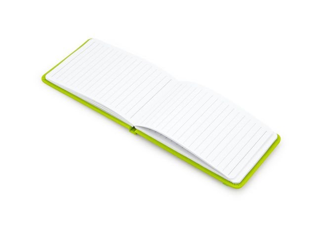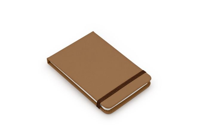 Libreta de notas vertical en PU, 80 hojas de papel rayado y banda elástica de cierre. Tamaño aproximado: A7.
