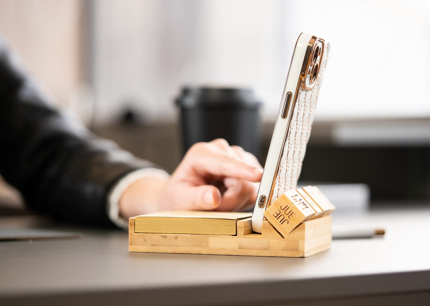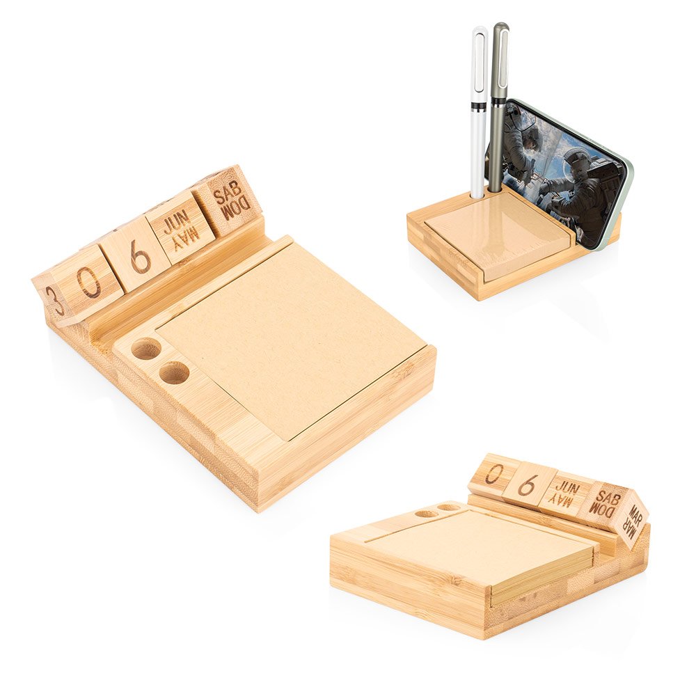 Porta notas de bambú con calendario perpetuo. Incluye 4 bloques giratorios de madera para indicar día, mes y fecha. Contiene 100 hojas de papel tipo kraft y compartimentos para bolígrafos o accesorios. Diseño funcional y ecológico para escritorio.
