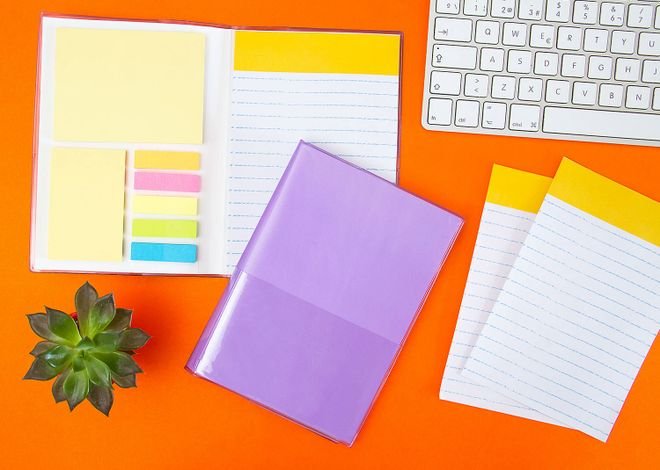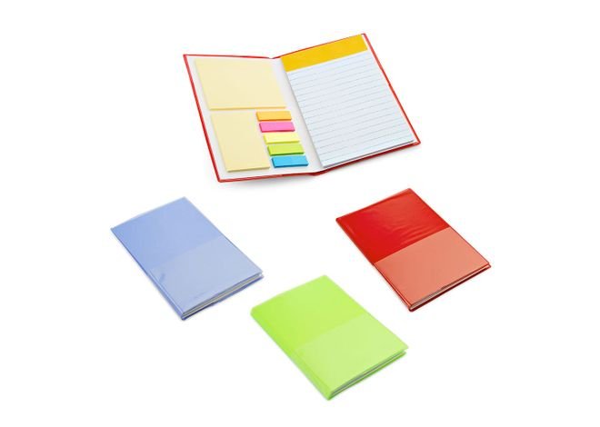 Set de memos y adhesivos que incluye: 40 hojas de papel rayado, 5 juegos de banderas en papel de colores y memos adhesivos por 40 unidades cada uno. Tamaño aproximado de la hoja A5.