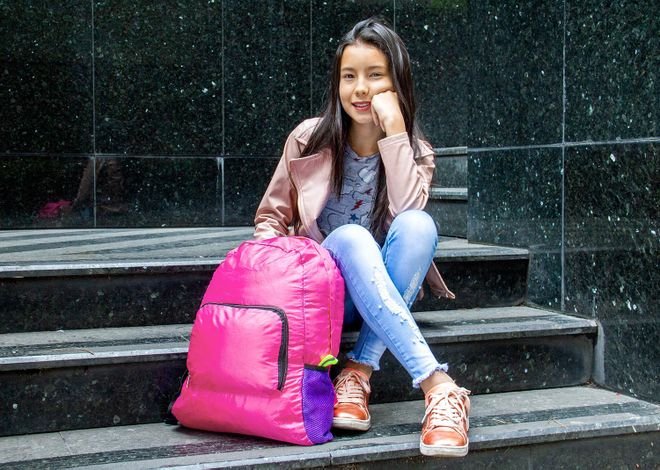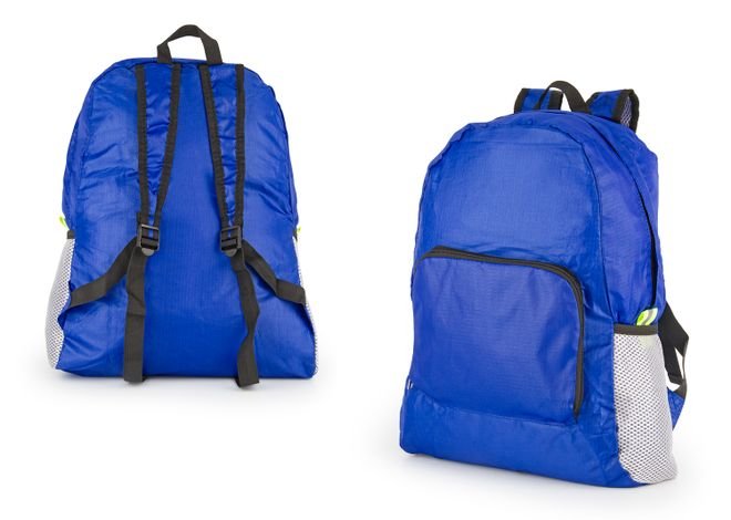 Morral plegable con agarraderas ajustables, bolsillos frontales con cremallera y lateral en malla.