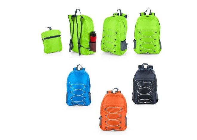Morral plegable impermeable con correas ajustables, cierre en cremallera con cubierta, bolsillo frontal con cremallera y banda elástica, bolsillos laterales libres en malla; al interior bolsillo con cremallera que se ajusta para guardar la maleta plegada. Capacidad de carga 19L.