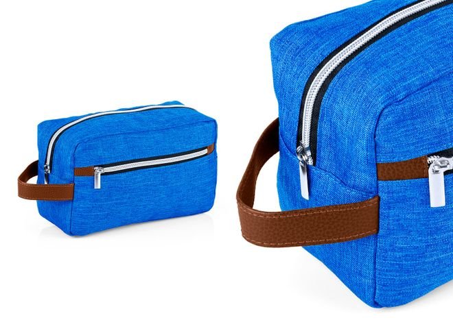 Estuche con manija imitación cuero, bolsillos principal y auxiliar con cierre de cremallera. Ideal para los productos de aseo personal y/o cosméticos.