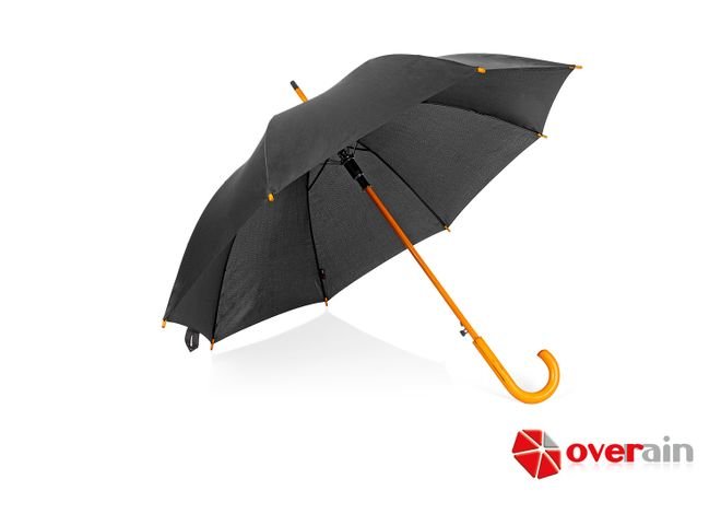 Paraguas mango curvo, de apertura automática y cierre manual. Costillas de acabado negro. Cierre con botón de madera.