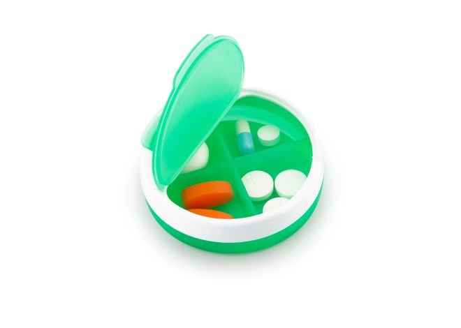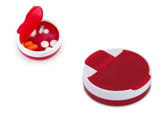 Pastillero plástico redondo de 4 compartimentos. Parte superior giratoria.