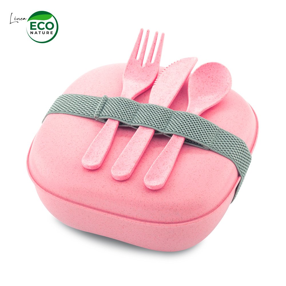 Portacomidas en plástico mezclado con material ecológico en fibra de trigo (50%-60% aprox). Incluye cubiertos, banda para cerrar y llevar los cubiertos. El porcentaje de material ecológico tiene un promedio de biodegradabilidad de 2-3 años después del fin de su vida útil.