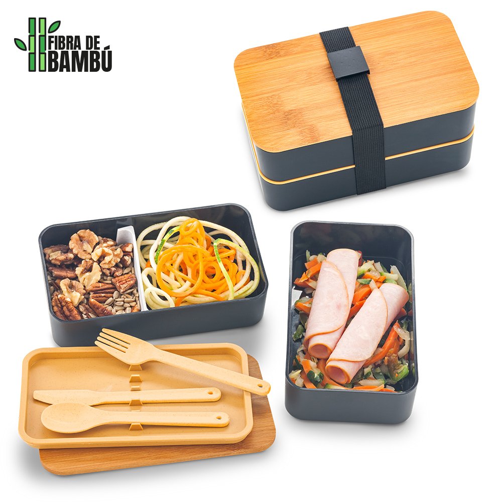 Portacomidas plástico de 2 compartimentos de 700ml de capacidad cada uno. Elaborado en plástico con fibra de bambú. Incluye set de cubiertos y elástico. Apto para máquina lava vajillas y microondas (máx 3 minutos sin tapa ni cubiertos).