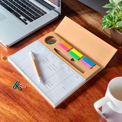 (Programador semanal con 100 hojas. Incluye bolígrafo ecológico, clips y banderillas adheribles de 6 colores.)