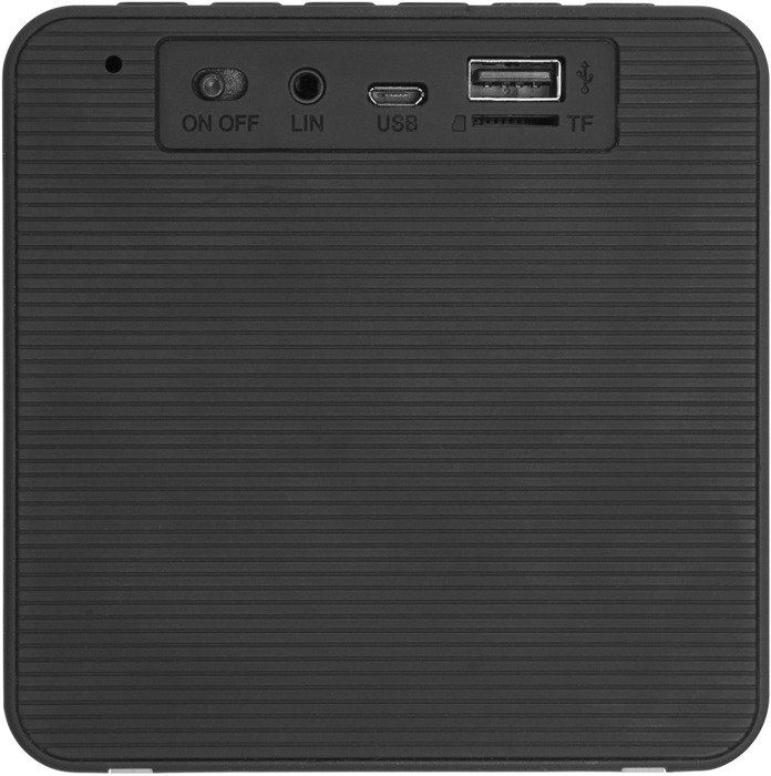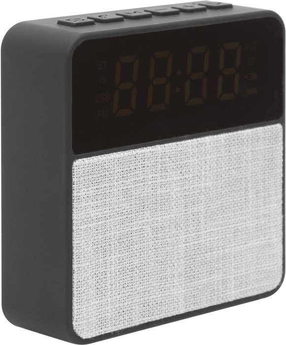 10,5 x 10,6 x 3,6 cm. Parlante Speaker, reloj y radio. Plástico con tela. En la parte superior botones de: reloj que permite configurar la hora, botón para atender llamadas, botón de modo que permite seleccionar bluetooth, con radio FM, tarjeta TF y entrada auxiliar, botón de volumen (+) y (-) y botón de play/pausa. Pantalla con luz led blanca que visualiza la hora, modo seleccionado y estado de bateria. En la parte de atrás perilla on/off, entrada plug, 2 USB y TF. En la parte inferior dos gomas antideslizantes. Alcance 10 metros. Cuenta con manual para facilitar la configuración.