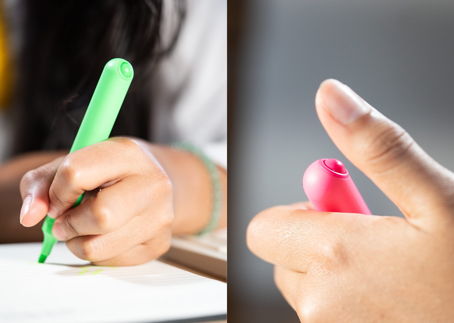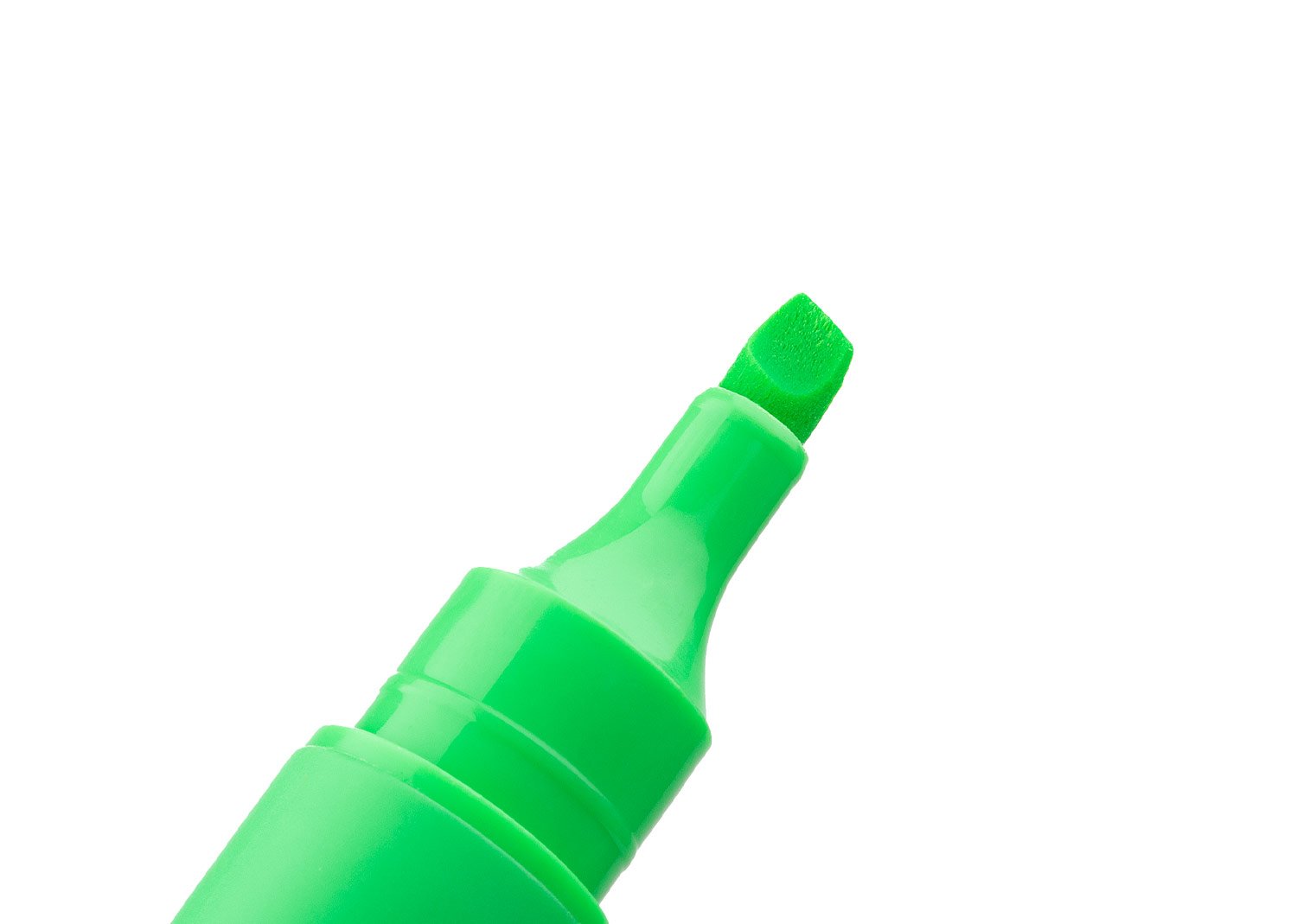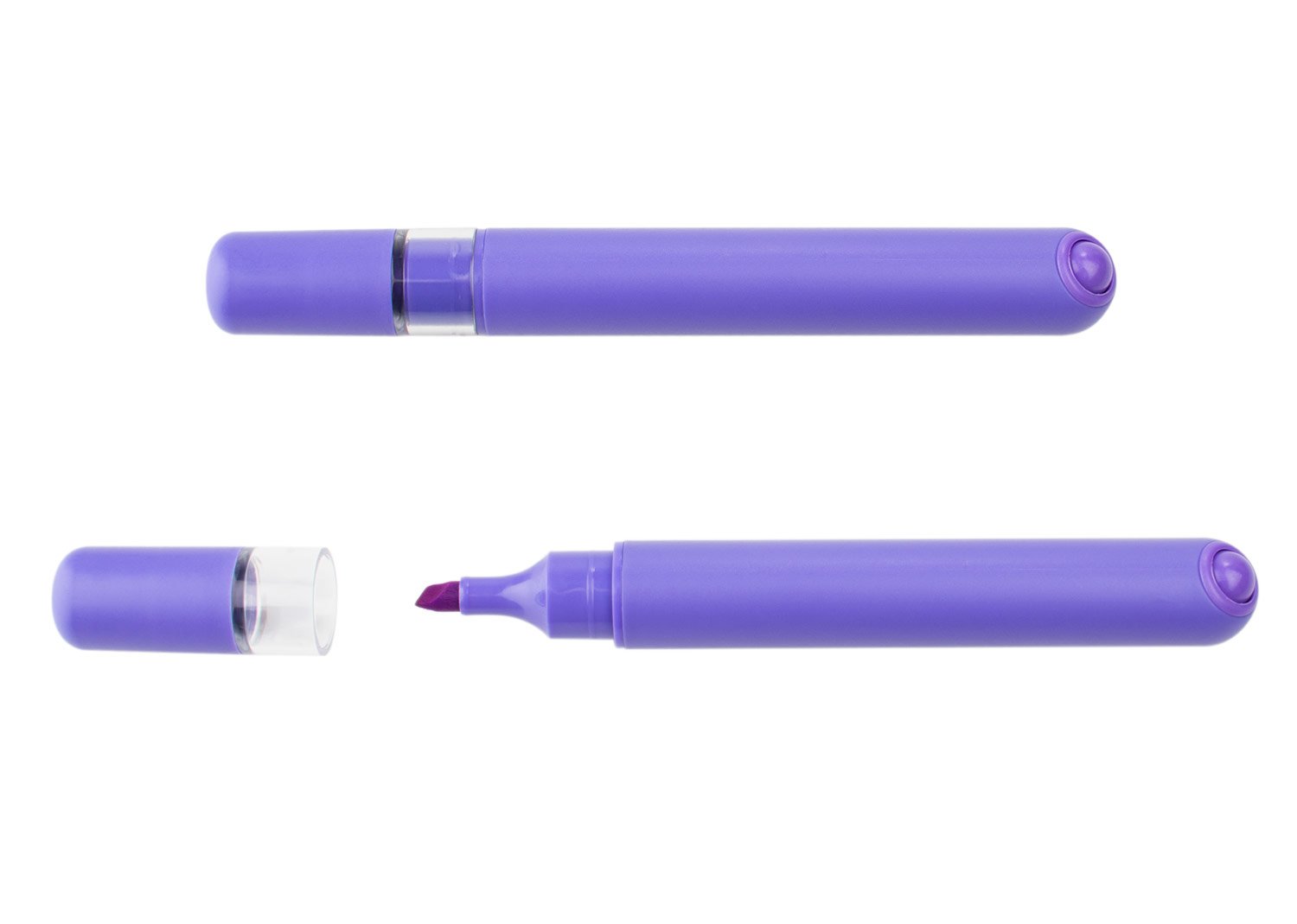 Resaltador plástico con cuerpo de color sólido con ribete transparente.