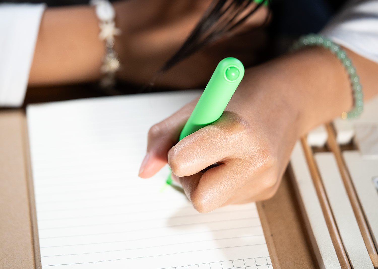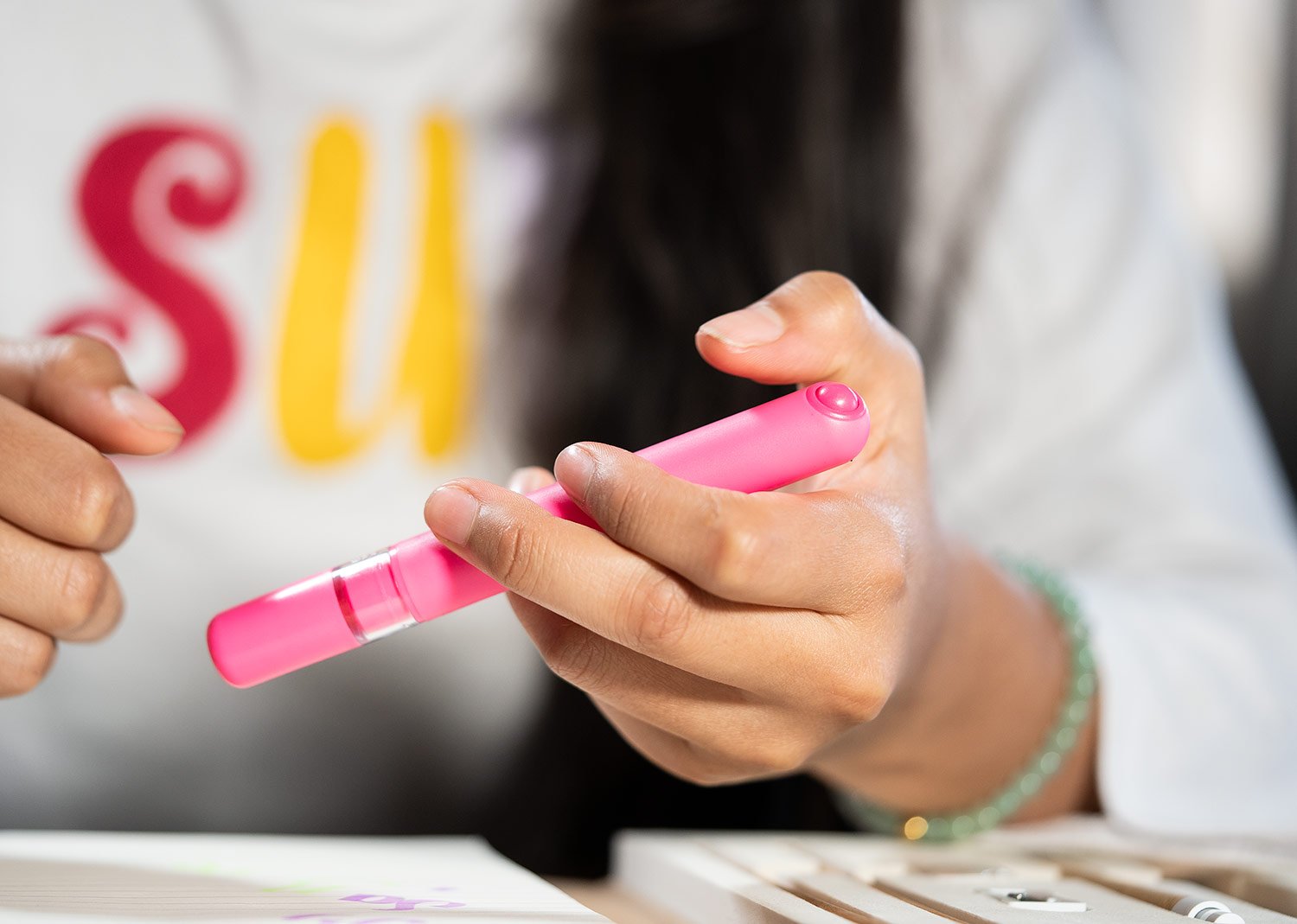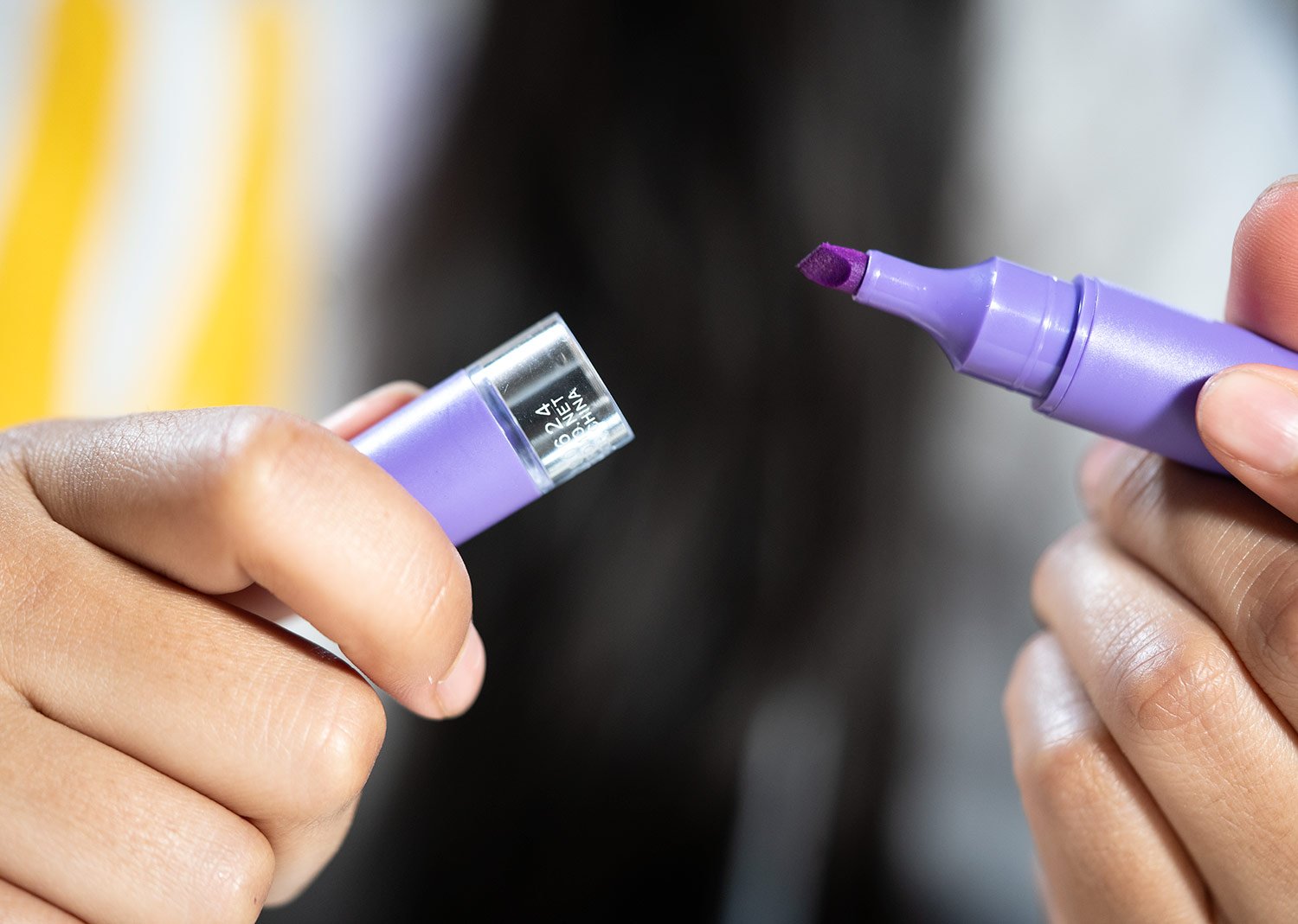 Resaltador plástico con cuerpo de color sólido con ribete transparente.