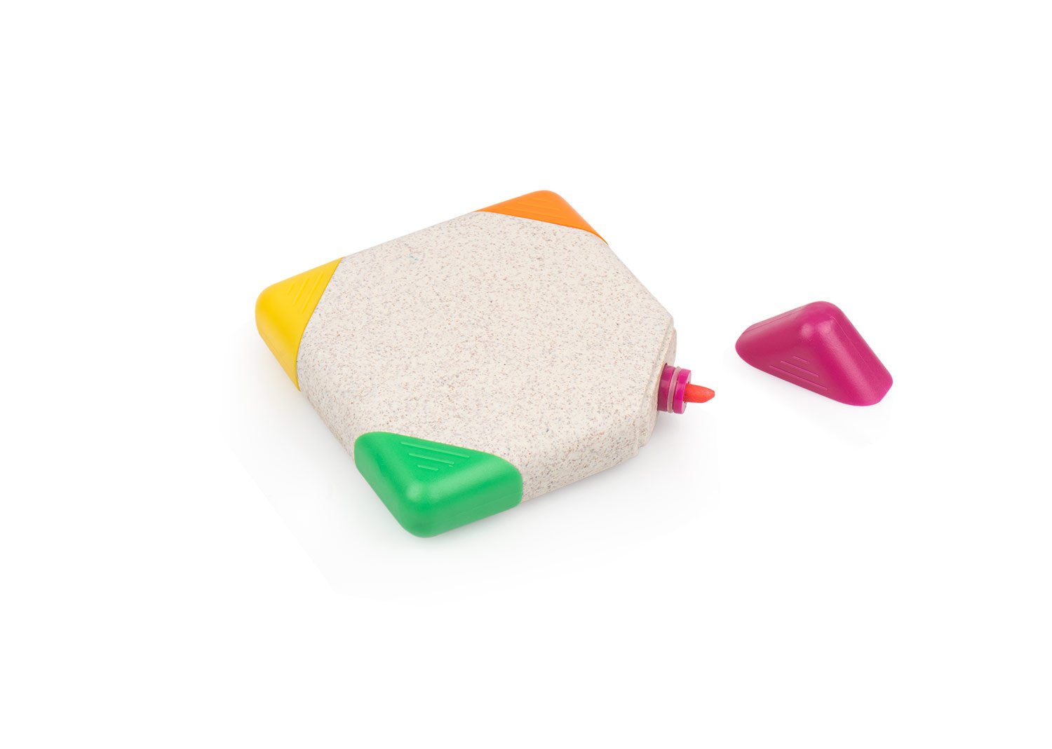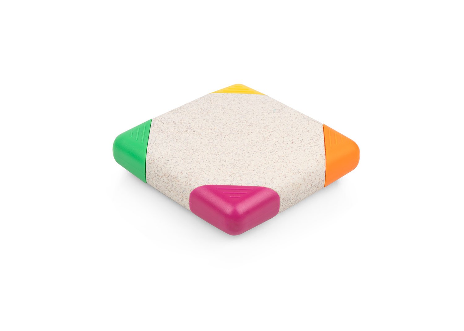 Resaltador en forma cuadrada, con 4 colores de tinta: verde, amarillo, naranja y rosado.