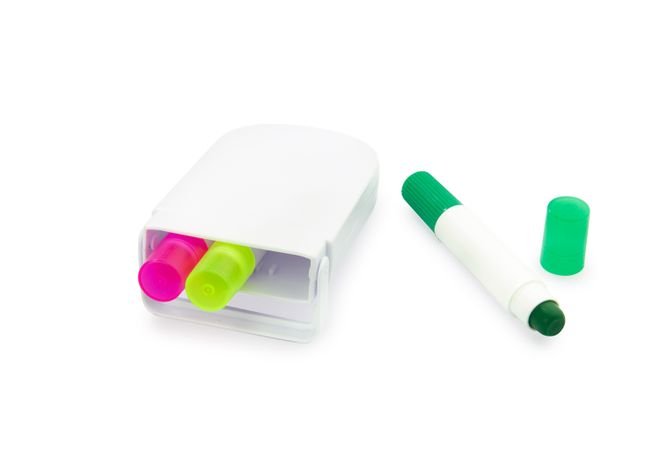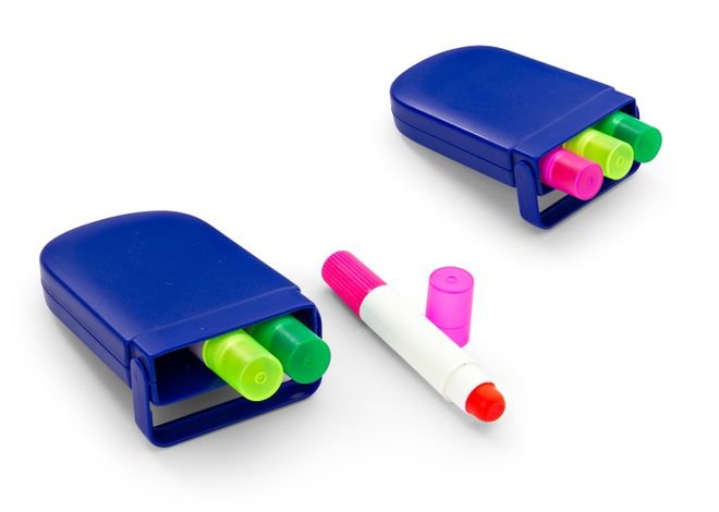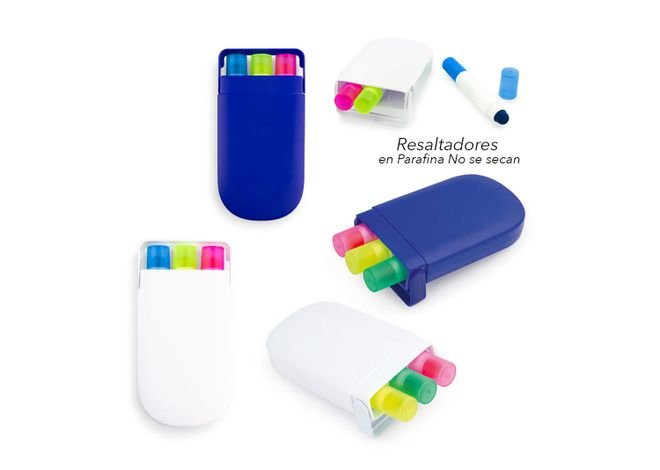Set en estuche plástico de resaltadores en parafina x 3 unidades, no se secan.