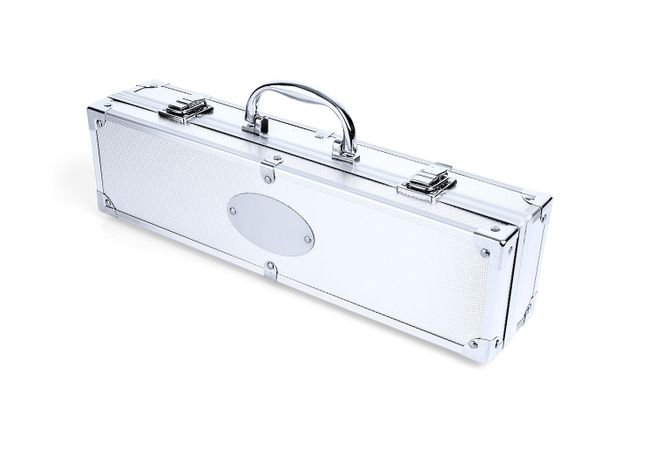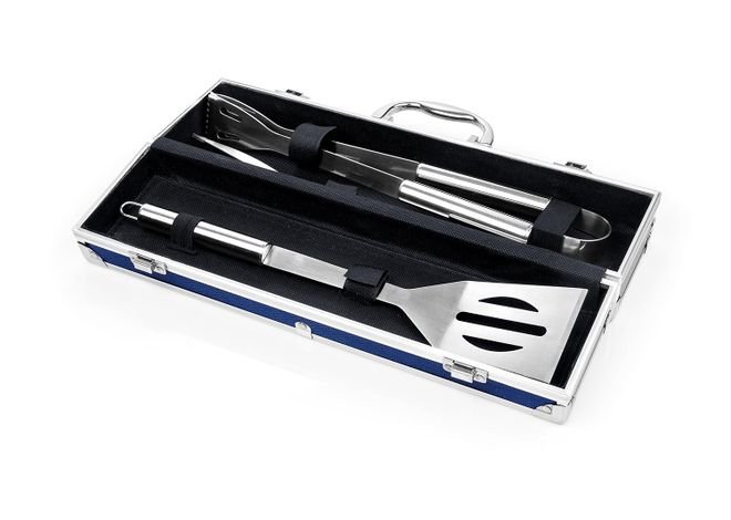 Set BBQ x 3 pcs. Incluye: Pala barbacoa, Tenedor de parrilla y Pinzas de parrilla, con estuche de lujo en aluminio, cierre con botones de presión y manija.