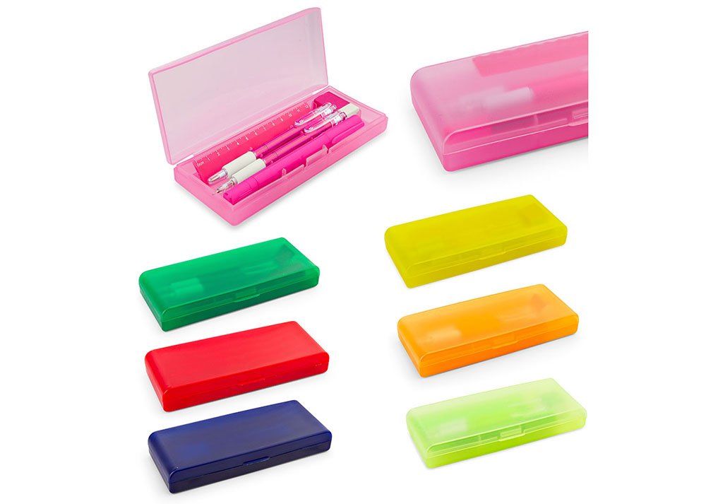 Set de escritorio en estuche plástico, contiene: resaltador, bolígrafo, portaminas, regla y borrador.