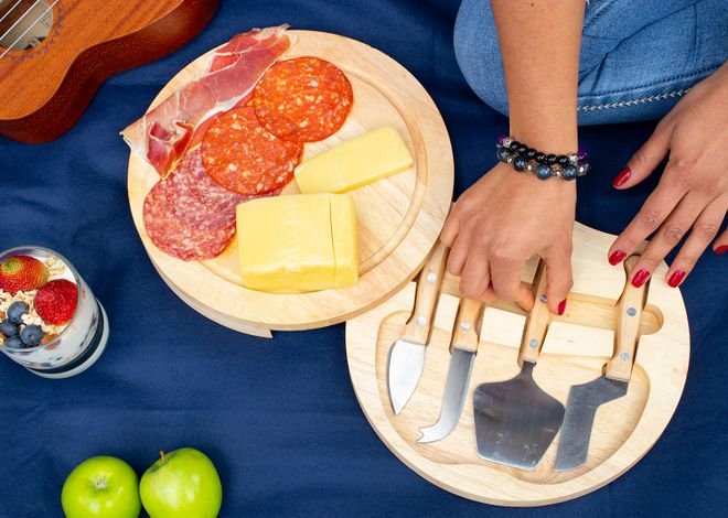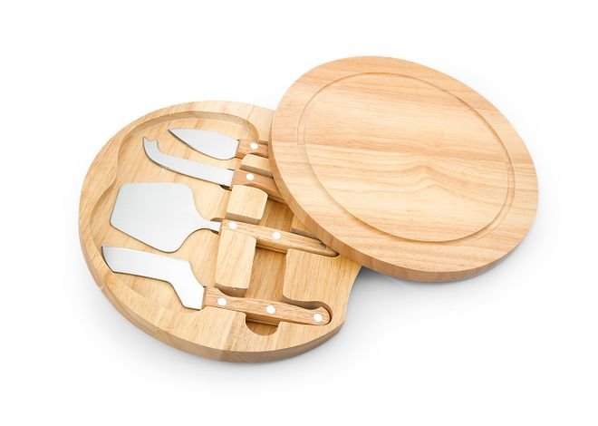 Tabla redonda con 4 Cuchillos para quesos. Lavar con agua y jabón y secar al aire libre.