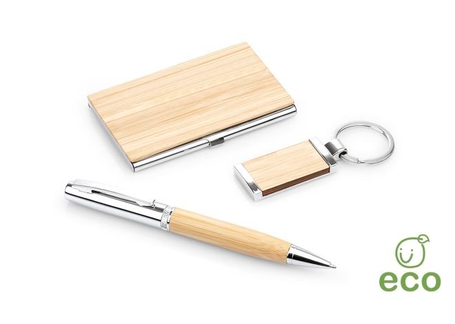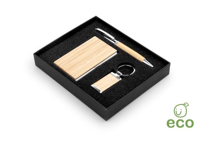 Set ejecutivo, incluye porta tarjetas metalico, llavero metalico rectangular y bolígrafo en Aluminio con sistema twist, todos con acabados en Bambú para la marca en laser, caja de regalo negra