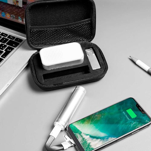(Incluye bocina bluetooth, batería auxiliar de 2,600 mAh, cable cargador y de transferencia de datos compatible con micro USB, 8 pin y tipo C, base para smartphone y estuche.)