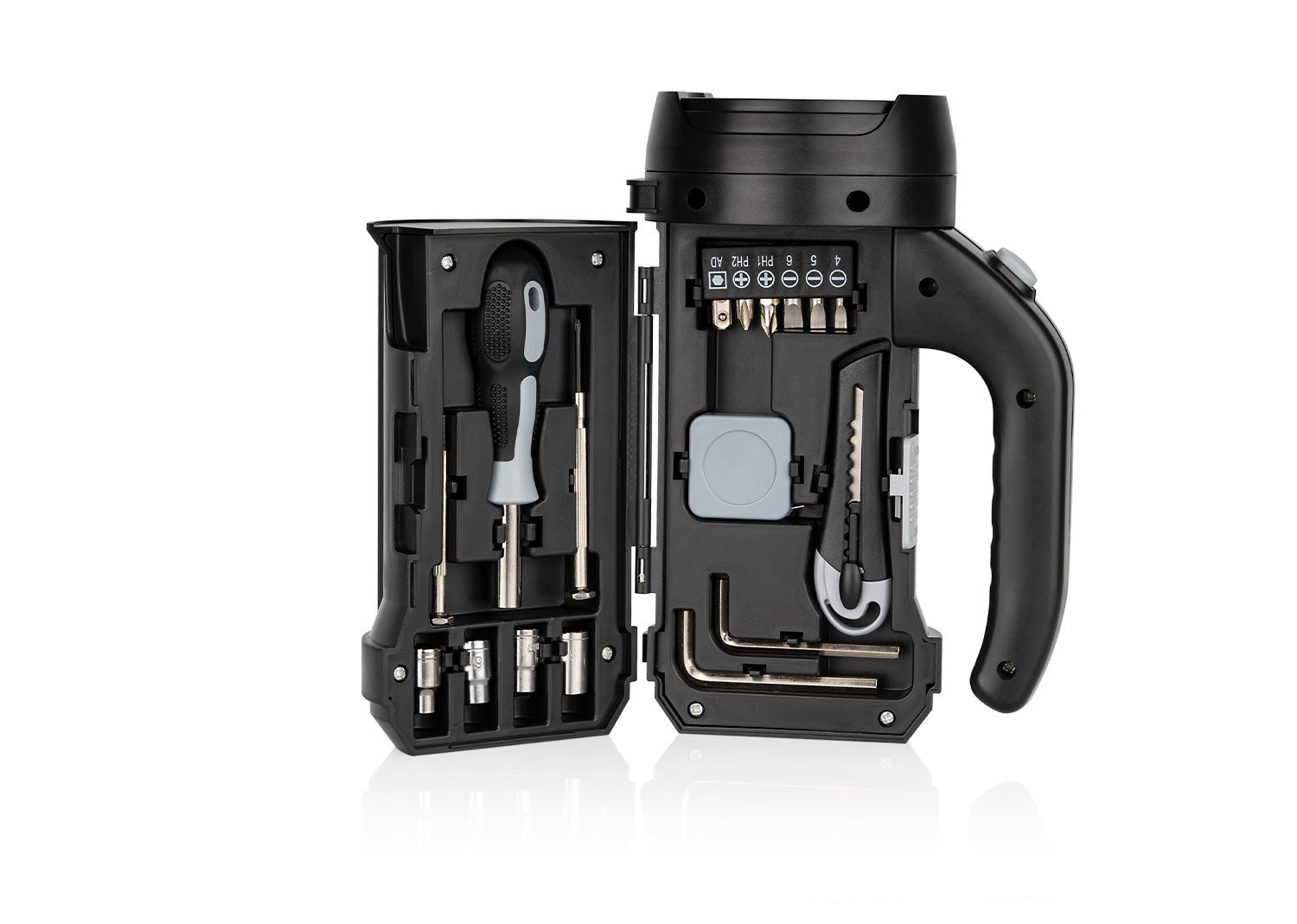 Caja de herramientas con linterna LED externa (3 pilas AA no incluidas). Incluye 4 copas estándar, 6 puntas de destornillador, 2 destornilladores de precisión, un portapuntas magnético, 1 bisturí, 2 llaves hexagonales y 1 cinta métrica de 1 metro (39 pulgadas).