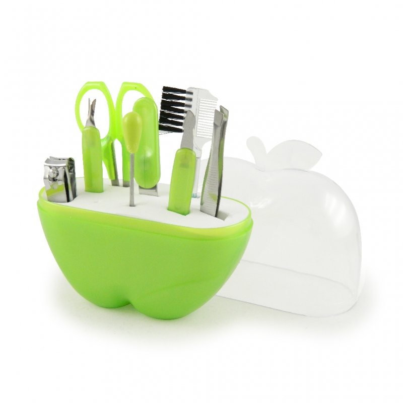 Utensilios para el cuidado de las uñas con estuche en forma de manzana.