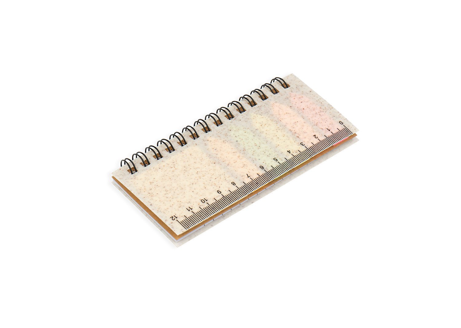 Set de memos con argollado ‘doble O’ y cubierta en paja de trigo. Incluye taco de 40 hojas rayadas y 5 juegos de banderas adhesivas en papel de colores de 25 hojas cada uno. Regla de 12 centímetros en la tapa.